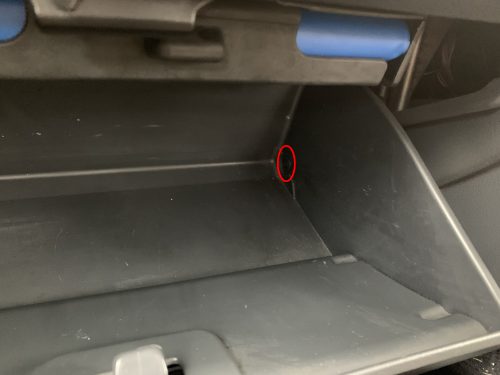 グローブボックスを開いて、右側ヒンジ部がグロメットで固定されています。